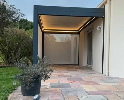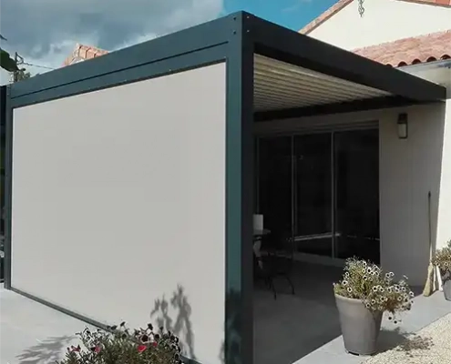 On dit « bioclimatique », car en position ouverte elle protège du soleil et du vent (résistant à des vents jusqu’à 120km/h).